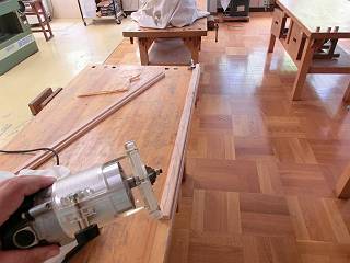 トリマーで縁枠を飾ってから、マイタゲージを45度にして角を落とす。