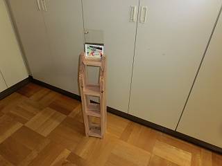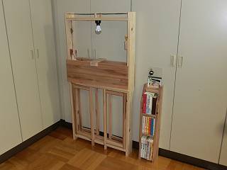 できあがりに、写真立ても取り付けて、本なども入れて見た。今日はここまでだが、こちらはワックスでの塗装にしてみる。