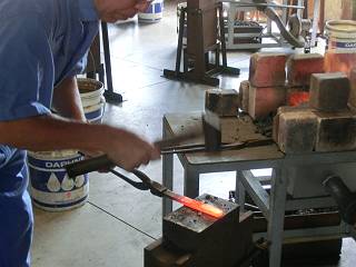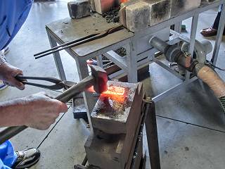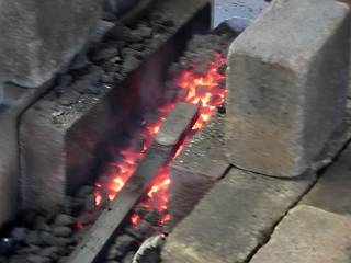 コークス炉で赤めてから、水を付けた槌で一度たたいて不純物をとり、接合剤を付けて鍛接します。