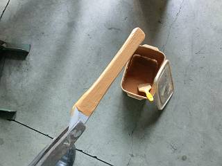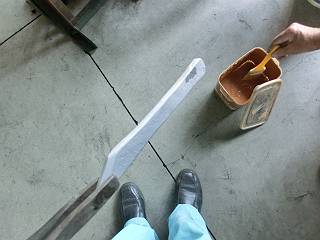 ブラスト後、砥の粉を全面に塗って乾かす。これで均一に焼き入れ>冷やしができる