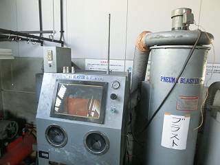 削り終えたら、サンドブラスターで表面をきれいにする。でこぼこを付けて、焼き入れの際に速く冷やす効果もあるとのこと。