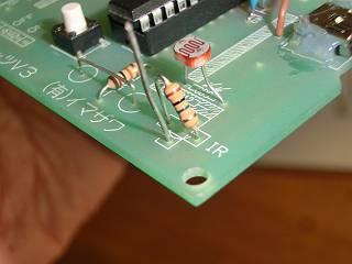 赤外線センサーを付けていたアナログポートに、プルアップ用の抵抗とタッチするための電極(リードの切れ端)をはんだづけする。