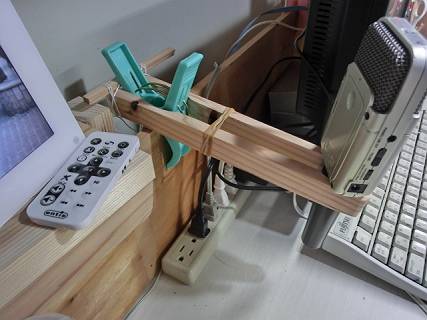 マイクと逆側は大型ピンチを後ろの板に固定してそこに挟み込む。結局windows7音声認識を使うよりも、自分でキーボード入力した方がストレスがたまらないことがわかった。