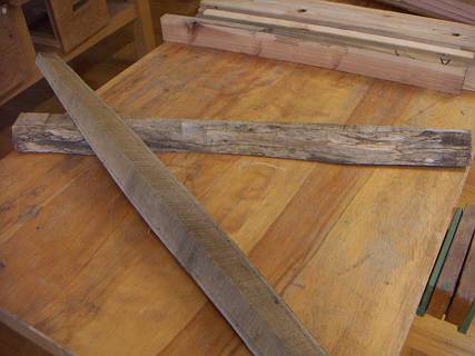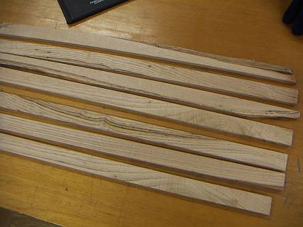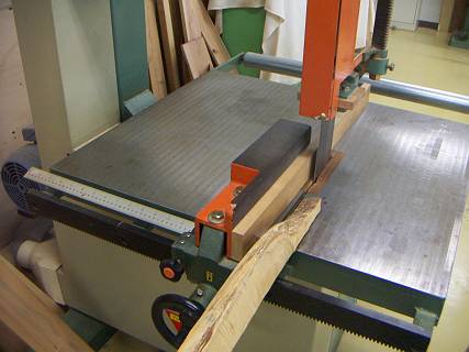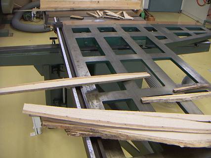 物置に積んであった材を使うことにして、まずは帯のこで薄板に切り出す。