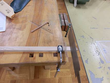 生徒にやらせるなら「とめ」のジグを作ってのこぎりびきでしょうが、ずくを惜しんで丸鋸で切断。