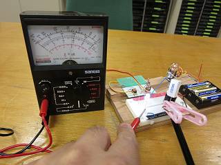 この豆電球は2.5Vのものなので、4.5Vの電源につなぐと切れてしまうだろうから抵抗をつないで制限する。