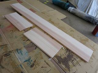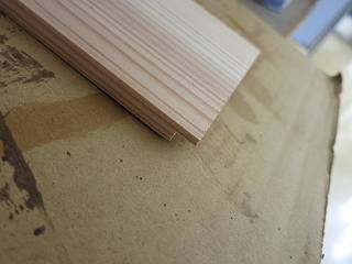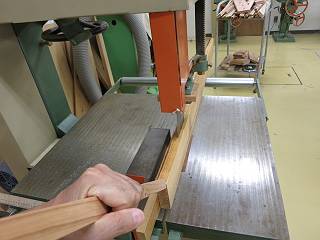 帯鋸で杉板を薄く縦挽きして材料をつくる。角の部分は少し欠いて木口を隠すことにした。