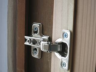 家具用のスライド蝶番を買ってきて,取り付ける。今回はインセットの金具を購入して扉側と本体側を逆にして使ってみた。