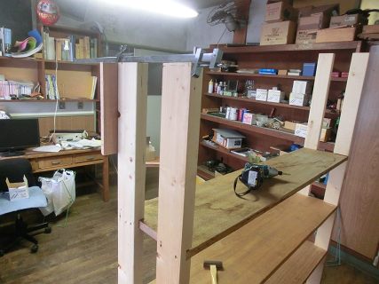 棚も結構あるのだけれど,残念ながらA4のファイルの大きさが入る棚がないので,今まであった引き出し戸棚をどけて本棚を作ることにした。