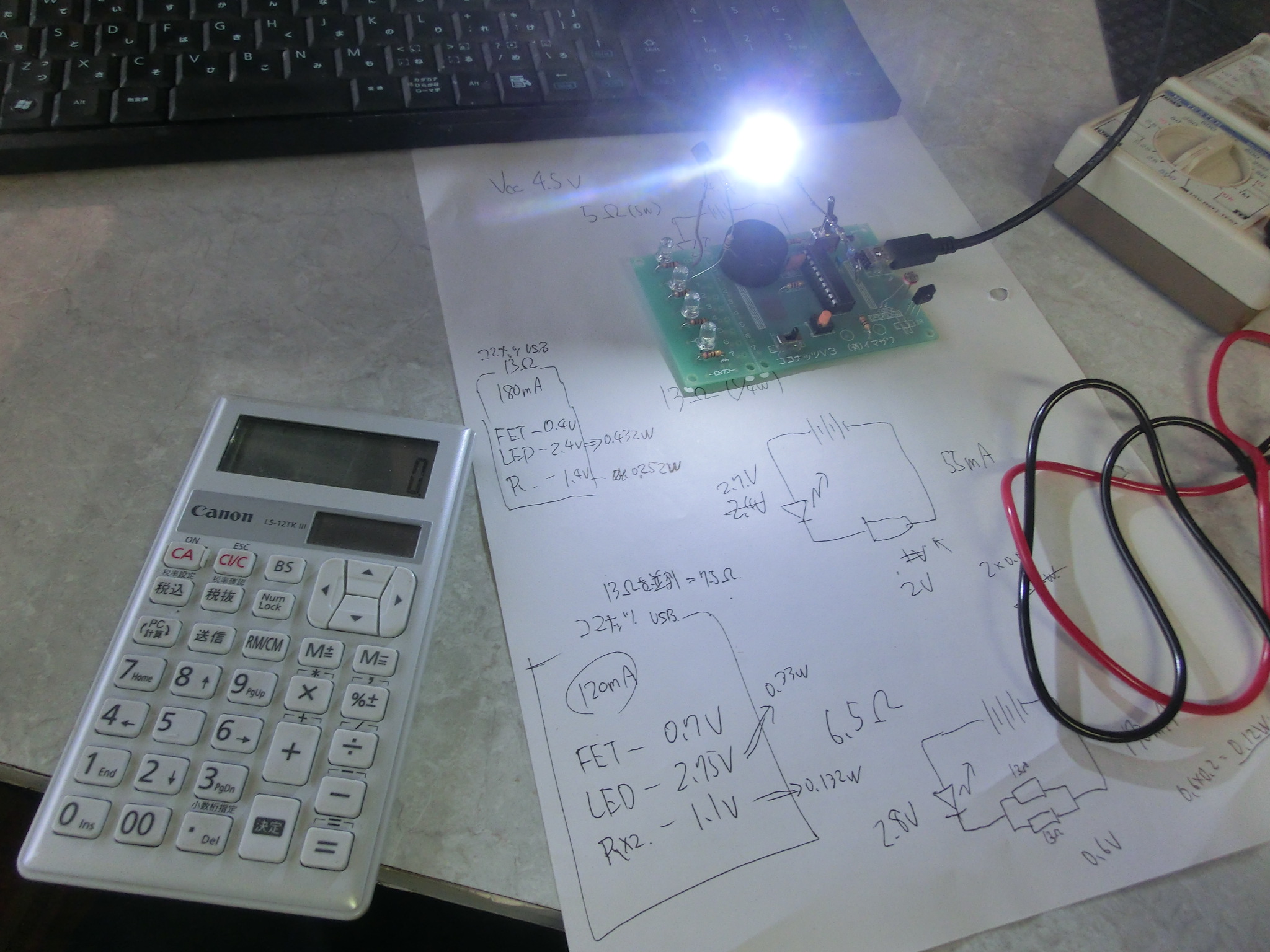 前回の設計をしてから、照明用のLEDの種類も増えて値段も安くなってきた。まずは様々な試して抵抗値で電圧と電流を決める。