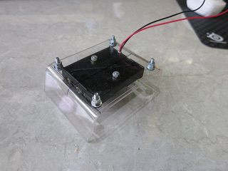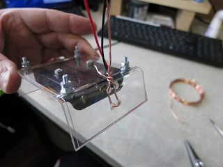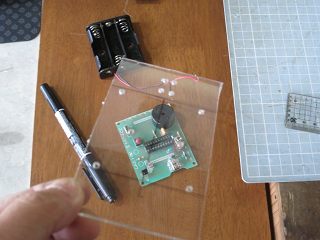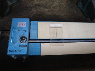 今度の物はPET材をはさんで両面に基板と電池ボックスを付けることにしてみた。アクリル曲げ機も年代物だがしっかり動作する。