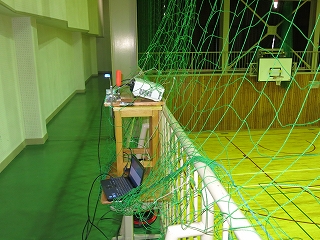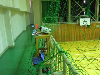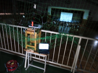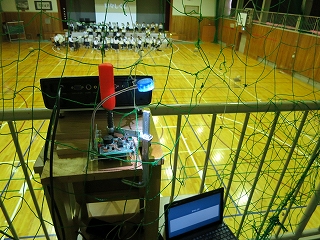 体育館後のギャラリーにプロジェクターを設置して,照明と映像をまかなうことを考えた。