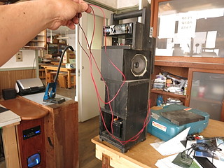 以前作ったバッテリー駆動のカーステレオセットに切り替えスイッチをつけて外部スピーカーとして接続。