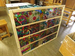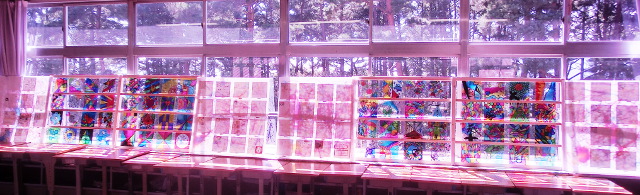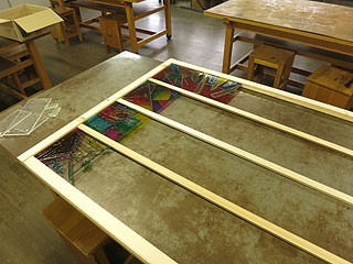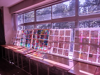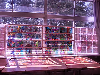 当日の展示より。森の中の学校なのでステンドグラスはなかなか見栄えがする。