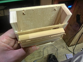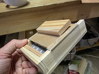 そこに木で作ったボタン?を取り付ける。丁番を使わずに養生テープで取り付けてしまった。キーを押すのは真鍮釘