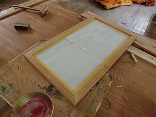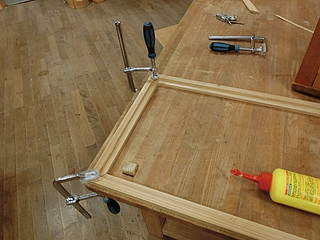 額縁はスギ板で作成。ルータやトリマはないので溝だけを横切り盤でひいて、角は45度に切断。