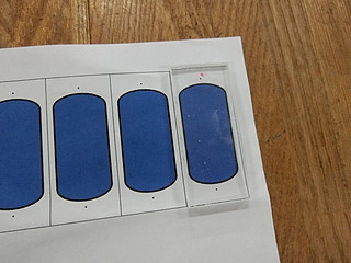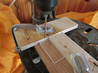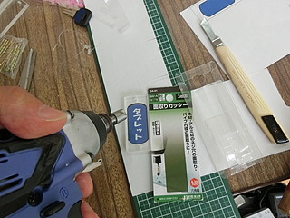 同じ位置になるように位置決め用の印刷の上に重ねて貼り付ける。アクリル板の角は鋭いので、穴と周りを面取りする。