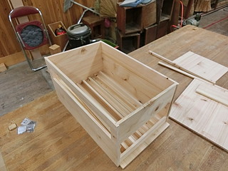 ヒノキの板を張り合わせて素材を作る。屋根部分は大きすぎてハタガネが届かないので重りを載せて張り付ける。