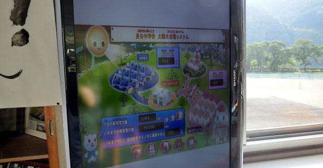 上伊那ではだいたいどこの学校にも太陽電池パネルが屋上に載っていて、その状況モニターが設置されている。