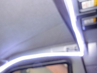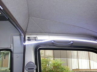 室内灯が暗かったので、12V用のテープLEDを天井周りに配置、デコトラ並に明るくなった。