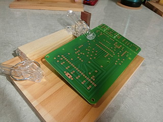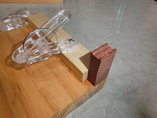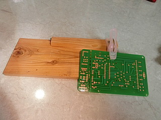 今回は以前から持ち帰らずに置きっぱなしになっていた生徒作品(自分が来る前のものですが・・・)を分解した材料を使って製作。洗濯ばさみは縦と横に取り付けた。前回はあり合わせのスギ板で作ったので、今回は横位置に基板をはさんでも周りにはみ出ない大きさに。