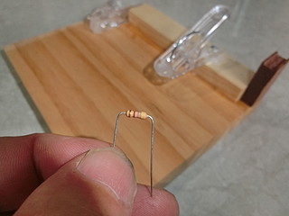 今回こだわってつけたのは抵抗の足折り曲げガイド。2.54mmピッチで3つ分の間隔に合わせて溝をつけた。