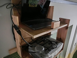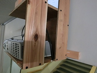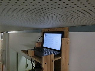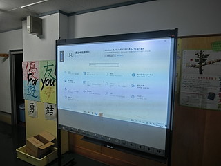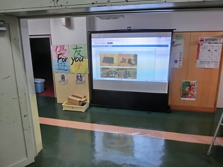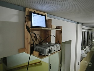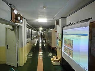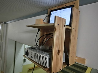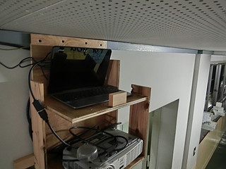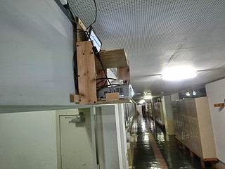 文化祭に合わせて、廊下にプロジェクターで掲示物を作ってみた。 研究係より、普段の授業の黒板を授業後に撮影したデータを地域や保護者の方々に見ていただこうという提案があり、階段を上ったところに提示することにした。 超単焦点プロジェクタが余っていたので、ノートパソコンとプロジェクタを収める棚を急遽作ってみた。 プロジェクタは上下を逆にして設置して、設定で180°回転させて投影することで、ちょうど廊下の反対側に置いたスクリーンいっぱいに投影出来た。 固定は壁の上部のなげし部分にコーススレッドで行ってつるす形にした。。 このプロジェクタは普段ほとんど使わないので、壁に白い紙でも貼れば常時使うことも可能かと思う。生徒も全員通るところなので、様々な情報を提示すれば良いかと。