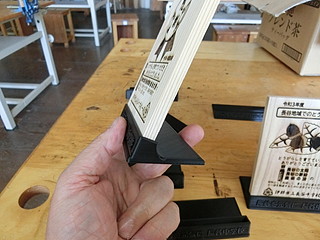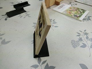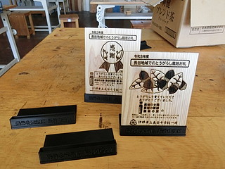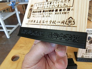自分の学校では、地域の方が育てていただいたとうがらしを使ってラー油を作っているので、いままでお礼はラー油だったけれど、今年は盾を贈ることにした。 ラー油はもうお持ちである家が多いので、生徒がデザインしたお礼の方が良いかなということもあった。。 今までは、台部分も木で作っていたが、角度をつけて削るのは難しいので3Dプリンタで出力出来るよう設計した。 3Dプリンタ用のstlデータはこちら → tate-stand.stl 先日購入した3Dプリンタはメモリにデータを入れておけばいつでも誰でも量産出来ると思われる。 台座部分には、文字もデザインしてみた。 お渡ししたところ、みなさん喜んでいただけるのでありがたい。地域に支えられる学校です。