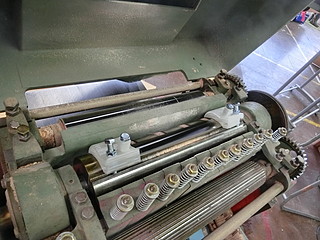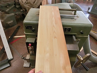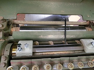 学校の木工室にある自動鉋盤、授業でも使うので年に一度は刃を研いで交換したいところ。