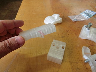 それで、左側のタイプを作った。1つのデザインで左右に使えるようにするつもりだったが、固定用のボルトの軸が鉋胴の中心にむいていなくて取り付けられなかった。
