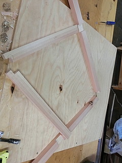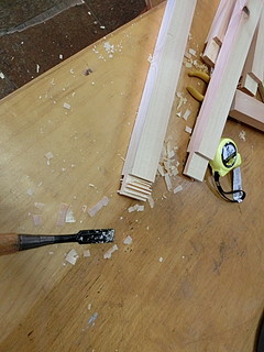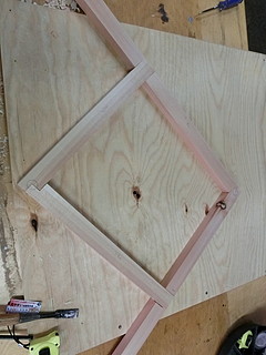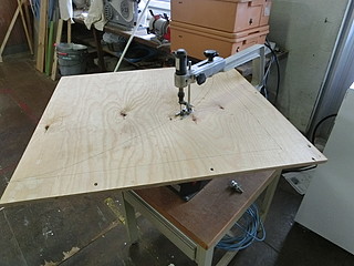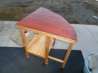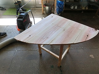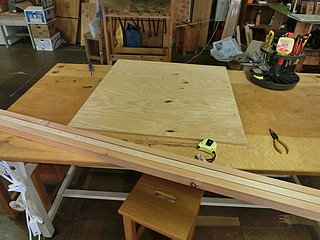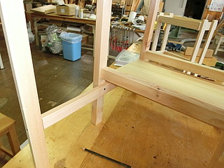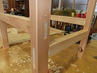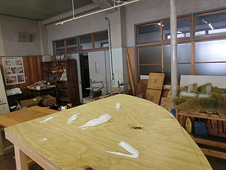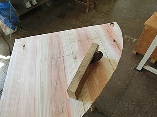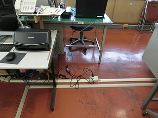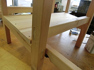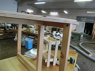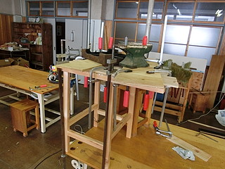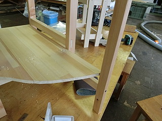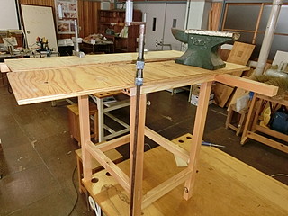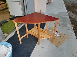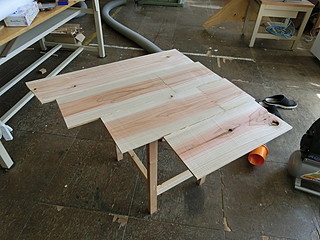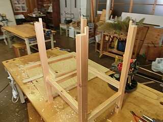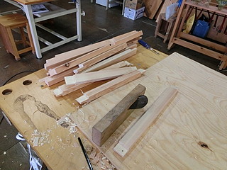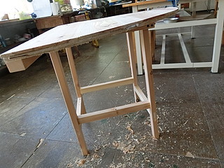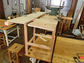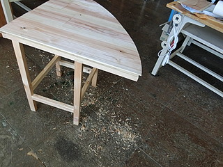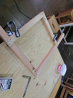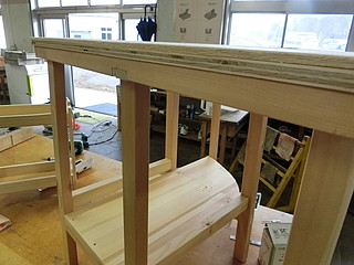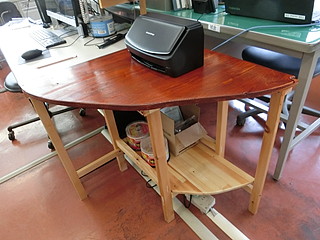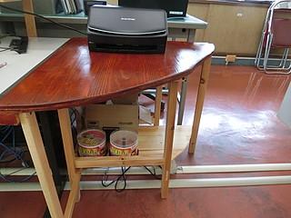 日曜日の作業で久しぶりに机を作ってみた。 職員室の机配置を変更して以来、以前の設計で取り付けたコンセントボックスが邪魔でつい毛手しまう状態だった。残り材でテーブルを作ることにした。 新たに購入したドキュメントスキャナを置くのが目的でもあるので、簡単な作りで設計した。 それでも脚の部分はホゾ組で壊れないようにしている。 天板との接続は、角のみの刃の大きさで簡単に留めるようにした。 ここで気がつかなかったのだけれど、当初天板の対角線に脚をつけるつもりだったのに内接の四角形で足を組んでしまっていた。 天板は一度構造合板を糸鋸で形を作ってから貼り付けた。 その後、スギ板を並べて上面に貼り付ける。 スギ板も糸鋸で大まかに切ってから・・・ 鉋で形を合わせて仕上げた。 さすがに脚がこんな位置では手をついたりするとひっくり返ってしまうので両隅に脚をつけた。 両隅の脚は縦方向の力がかかるだけとして、コースレッドで簡単に取り付けることにした。 したのホゾには板を渡して物を置けるようにした。 天板だけは水性のウレタン塗料を何度も塗って仕上げたが、脚部分は透明のスプレーラッカーでの仕上げ。 こんな形で通り道を確保しながら、したのコンセントボックスをカバー出来た。 もちろん、スキャナも上に置いて活躍している。