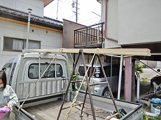 帰りにホームセンターで材料を買ってくる。根太に使う垂木は4mのものを買ってその場で切断して持ち帰った。高さが2.5mに収まらないといけないので、脚立で調整。