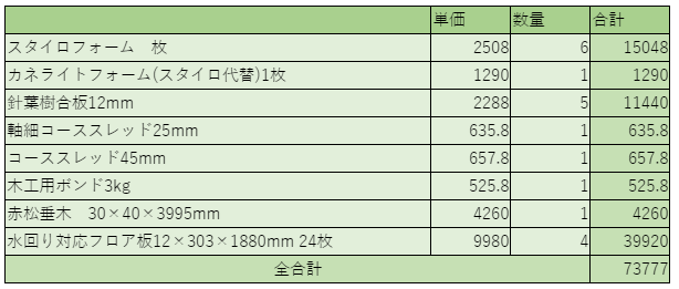 実際には以前からの手持ち材料として、合板3枚、垂木15m分くらいがあったのでもう少しかかっているが、結構な金額となった。