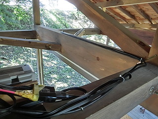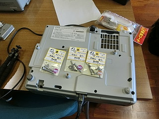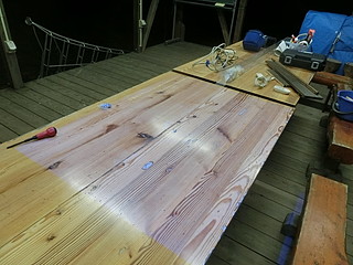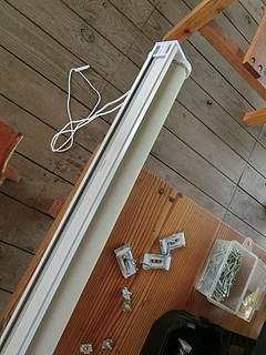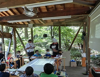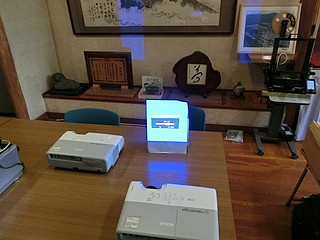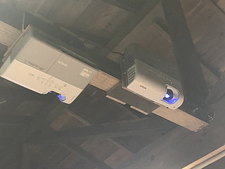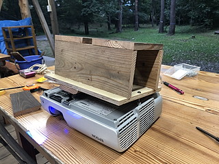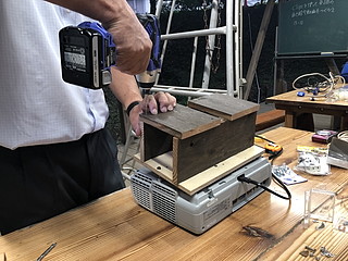 自分の勤務する学校は、学校林が校舎に隣接しており、子どもたちは林間と呼んで親しんでいる。 そこには、「森の教室」という場所があって、子どもたちの学びに利用している。 一人一台のタブレット端末をより利用するために、プロジェクターを設置した。 以前は教室で使っていたプロジェクター、現在黒板上に常設の超単焦点プロジェクターがあるので眠っていた。 使えそうなものをチェックして、天吊り用に画面の上下を逆に設定にする。 スクリーンは、遮光カーテンを買ってきて利用することにした。 これは簡単に取り付けることができた。 本体は、梁に抱かせて固定するために、余り材を加工する。 柱を包み込んで固定した。 古いプロジェクターでVGA入力しかないので、HDMI→VGAの変換器を取り付けて7mのHDMIケーブルによって接続する。 2つ余っていたので、壁方向に加えて天井から机に投影する方向にも取り付けてみた。 それぞれの方向に大きさや台形補正を行って調整する。 2400ルーメンで、かつ何年も使った後のものなので少し暗いけれど、利用価値はありそう。 授業での利用の様子。今年度この林間にWi-Fi環境が整ったこともあり、利用の機会が増えるとよいなと考える。