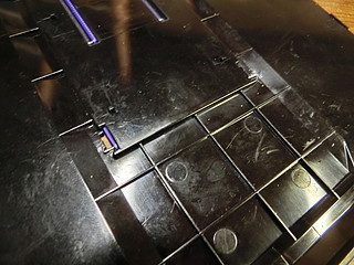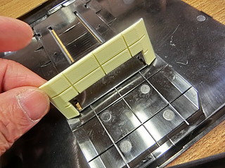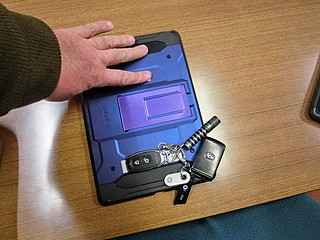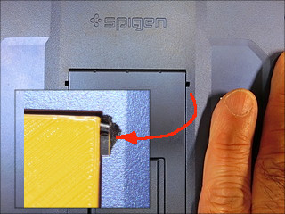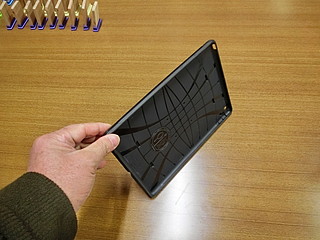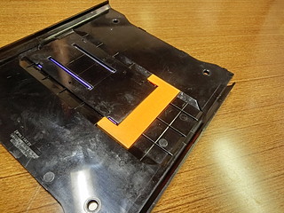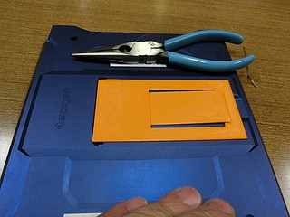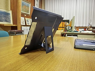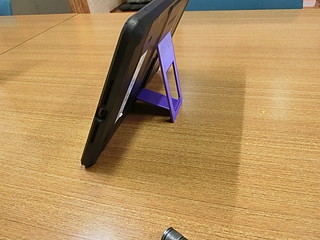 本校では一人一台のiPadが用意されている。ケースもついているのだけれど、使っている中で壊れてしまうことはある。 以前にもう一世代古いiPadのケースの足を作ってみている これが本来の状態。前回も、赤矢印先のように足自体が壊れたのではなく、足を保持する本体の受け側が割れていたものがほとんどだったが、お手上げ状態だったものを今回着手した。 今回、裏側の割れていない部分までヒンジの軸を延長して、上からずれないように押さえ込むという方策をとってみた。 足のパーツが2つと、裏側の押さえパーツが1つ、全部で3点を3Dプリントする。 足自体は壊れていなくても、ヒンジの軸を延長することができないので新しいものにしてはめ込む。 これが完成した状態。特に不具合なく機能するが、割れた部分が見苦しいのは我慢してもらう。 最終的な裏側の様子。本校では58台中6台を修理することになった。1割程度が壊れていたことになる。子どもにとってはずっと我慢が続いていたので、ずいぶん感謝された。他校でもおそらく修理を望む声は上がっているかと思うので、必要に応じて対応しようと思う。