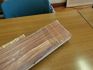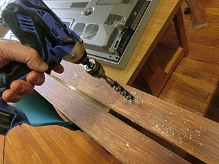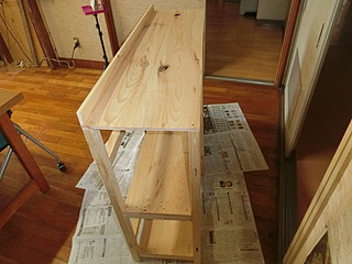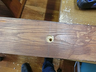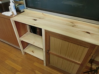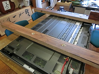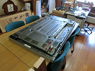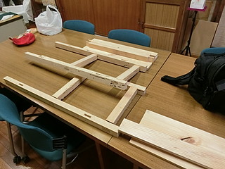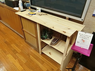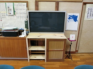 校長室に来たお客さんや学校見学の保護者に向けて、プレゼンテーションを見せる機会が多いので、大画面テレビを設置することにした。 これまでは、32インチのテレビにHDMI入力で送っていたが、春休みに55インチのテレビに更新することにした。 このテレビは古いものなので、HDMI入力が無くて昨年一年間全く使われていなかったので校長室にもらった。 旧森の教室を解体した際に出た柱にマウント位置へ穴あけして取り付けた。M8のボルトが埋まるように何回か穴あけした。 アナログ15ピンのPC入力はあったので、HDMI→VGAの変換機で接続した。 ついでに、大きさに合わせた棚を作ってみた。こちらは溶接講習で中学校に行っているときに、角のみ盤他の木工機械を使って部品作りをしてきた。 校長室なので茶色の方がよいかとも思ったが、手元にあった透明ウレタン塗料で塗装をすることにした。 これで大画面で学校の様子やデータを見せて伝えることができるようになり、壁紙の代わりとしてもお客が来たときは電源を入れて利用している。