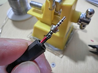 4極プラグの2つだけを使ってはんだ付け、カメラのリモートレリーズジャックに差し込む。