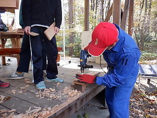 材料は中学校の木工室をお借りして長さに切ってきた。子どもたちは表面のかんながけと穴あけ、組み立てを行った。