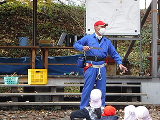 登山用のハーネスなどをお借りして、コーディネータの先生と二人で取り付ける。