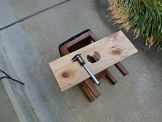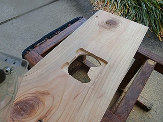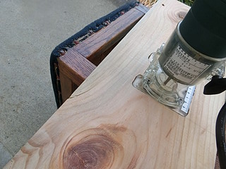 トリマに附属しているガイド枠を写し取って、厚み分だけトリマで彫り込む。
