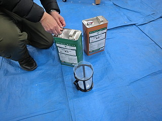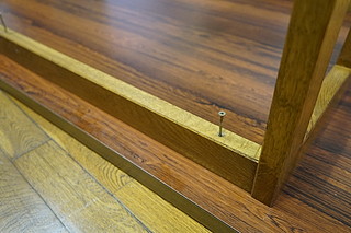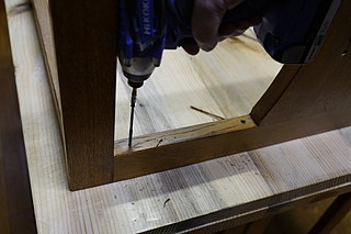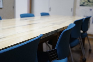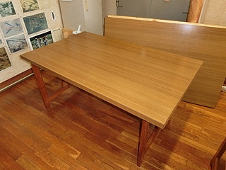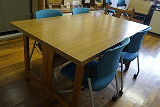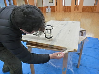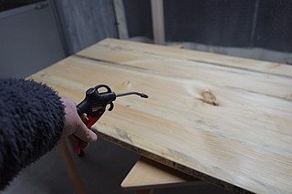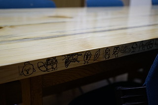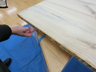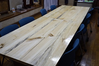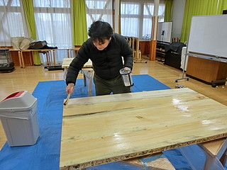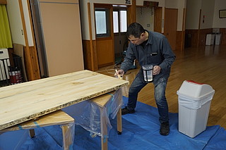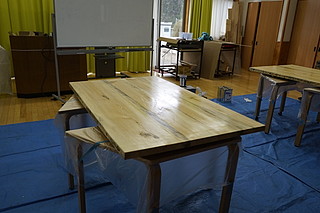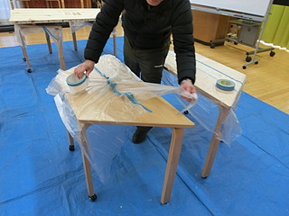 最後は塗装になるが、なんと教頭先生の実家は塗装業だったのでプロの道具と塗料を使うことができた。 塗料は2液混合型のウレタン塗装。今までよく使ったものとは硬化剤がある分だけ仕上がりが別物になる。これは最初のシーラー。これも2液混合。 シーラーを2度塗り、表裏で4回は感想をはさむので、年末休みに夜もはさんで作業した。 その後仕上げも2度塗り。硬化剤が混ざってから10分程度で全てを塗りおえないと塗料がのびなくなってしまう。かなり厚い塗膜になった。 乾く度に600番のペーパーを当てて、コンプレッサーで埃を飛ばす。部屋の中と渡り廊下とで作業をした。 3日くらいかけて全ての塗装が終わり、前の机の天板と差し替える。コーススレッドで止まっていただけなので簡単に変えることができた。 これは元々付いていた天板、木目がプリントされている。 今回差し替えた天板、アカマツ枯れの特徴でアオ(水分が多いのでカビのようなもの)が入っているが、リサイクルの証で評判も悪くない。 今回は柾目挽きした板を使ったものの、多少は反りが出てしまった。しかし業者さんにも指導いただき、無理矢理締めることはやめて足の高さを3Dプリンタで作成した靴を履かせて調整することでがたつきをなくして使っている。 横には6年生がアレンジした絵が彫り込まれている。来校者にも話題が提供できてありがたい。